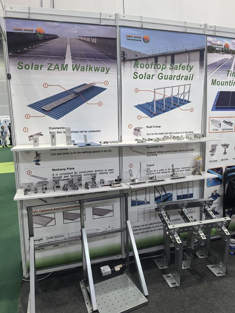 கண்காட்சியில், கவ்விகள், கொக்கிகள் மற்றும் எல் அடிகள் உட்பட பல கூரை பாகங்கள் காட்சிப்படுத்தினோம். வாடிக்கையாளர்கள் தங்கள் நிறுவல் சூழலின் அடிப்படையில் வெவ்வேறு சேர்க்கைகளைத் தேர்வு செய்யலாம். கிளாம்ப்கள் அல்லது எல் அடிகள் வண்ண-பூசிய எஃகு ஓடுகளுக்குப் பயன்படுத்தப்படுகின்றன, அதே சமயம் கூரை ஓடு கொக்கி சோலார் பீங்கான் ஓடுகளுக்குப் பயன்படுத்தப்படுகிறது. வாடிக்கையாளரின் வண்ண-பூசப்பட்ட ஸ்டீல் டைல் மாதிரியின் அடிப்படையில் கிளாம்ப்களைத் தனிப்பயனாக்கலாம் அல்லது ஆன்-சைட் பயன்பாட்டிற்கு ஏற்றவாறு ஹூக்கின் கையை நீட்டலாம்.